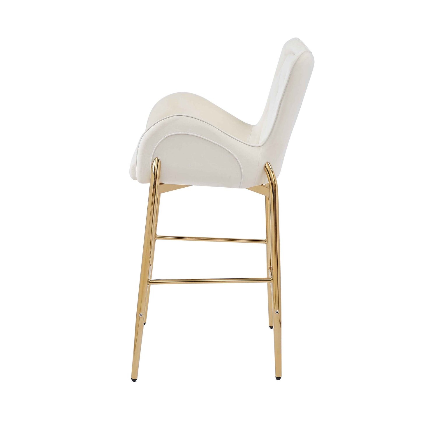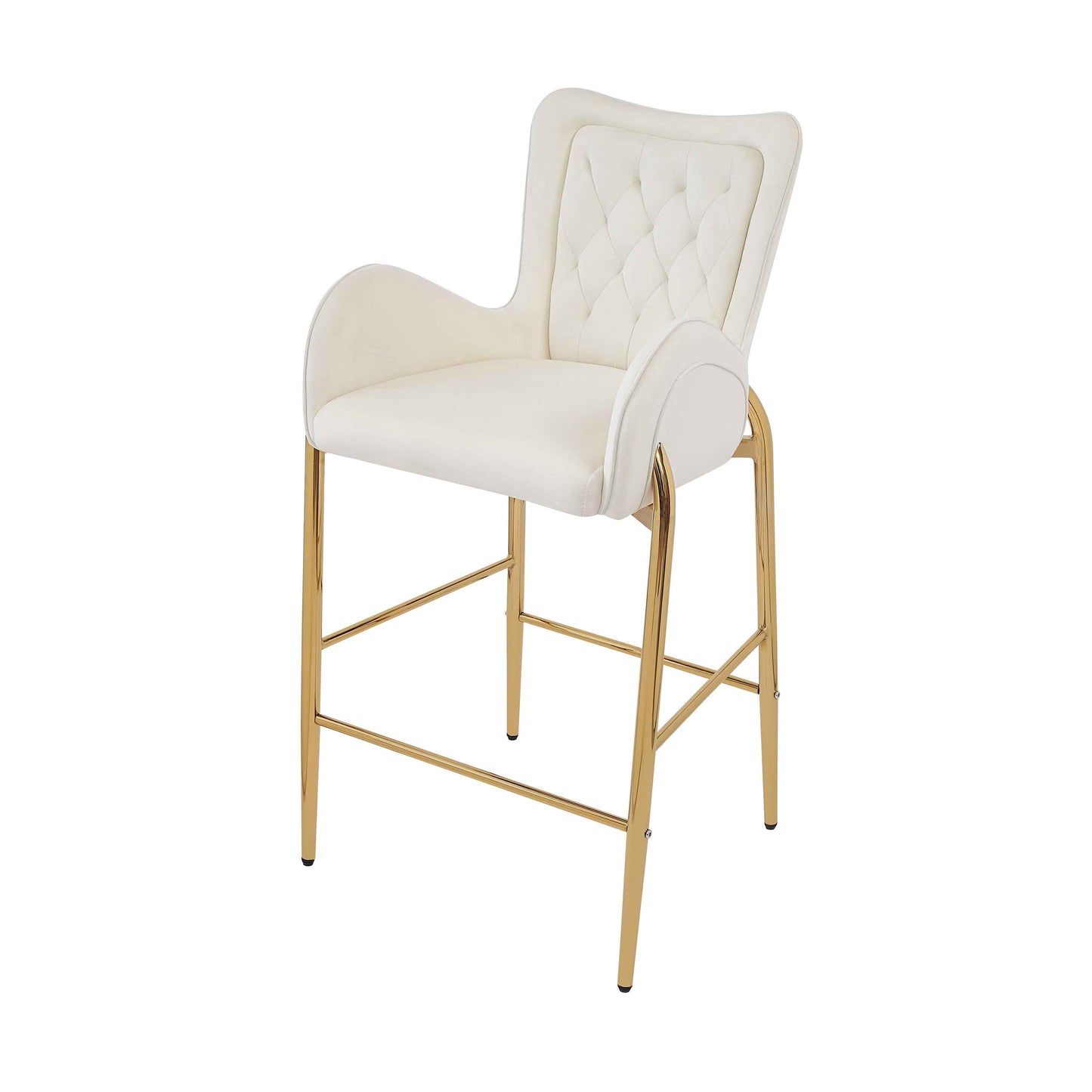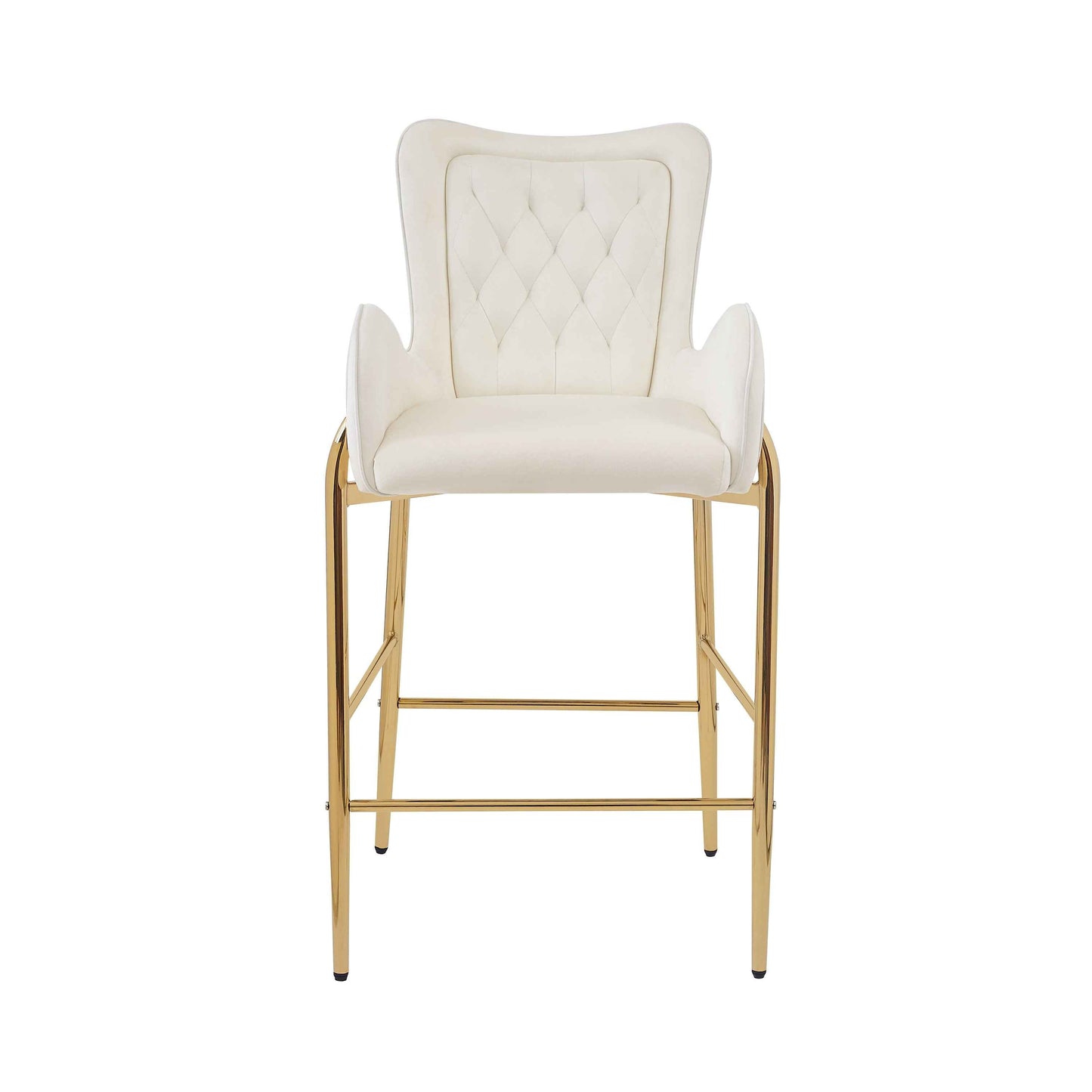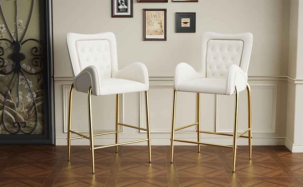 Summary | Enhance your kitchen or dining area with this set of 2 counter-height bar stools, standing at 28.75 inches. They boast a chic golden metal frame and footrests, paired with foam-filled velvet fabric for supreme comfort. The curved arms and tufted back add a touch of elegance, while the easy assembly (10 minutes per stool) and choice of two colors ensure they fit seamlessly into your space. |
