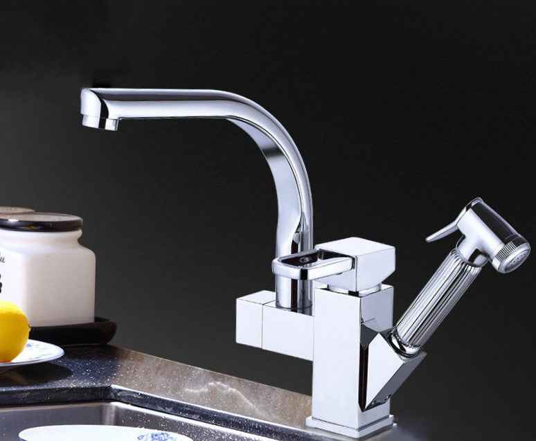 This rotating pull-out faucet features copper casting and reliable high-quality brass. Its stunning design features a modern and simple style and a pull-out spray gun for pressurized cleaning. It has a ceramic disc valve core, 35mm valve seat and a 1.5 nominal pressure. There are two colors and two options available to choose from.