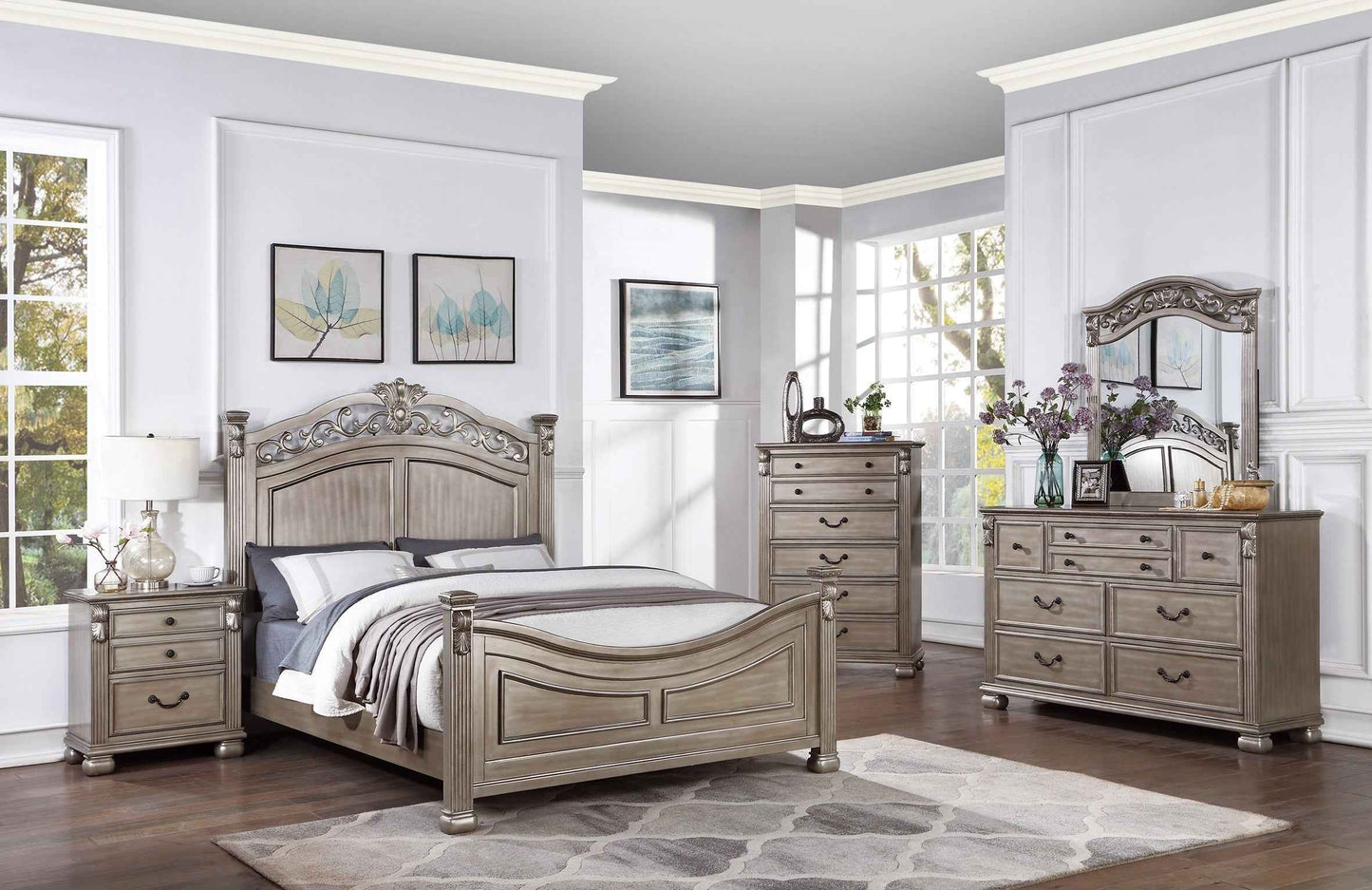 Classic molding with the well crafted finishing that creates a lasting style for this bed frame. The bed headboard consists American traditional style with a sense of delicacy and proper look, and it has the options for queen, California king, and Eastern king sizes. With the craftsmanship that goes into this bed, it brings the best quality into your bedroom. Comes with nightstand, mirror , dresser, and chest that matches perfectly with the bed. A master bedroom set that complete your favorite room.