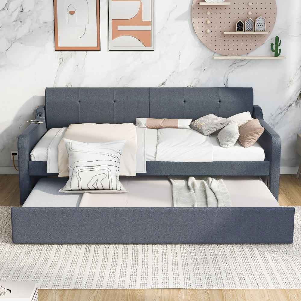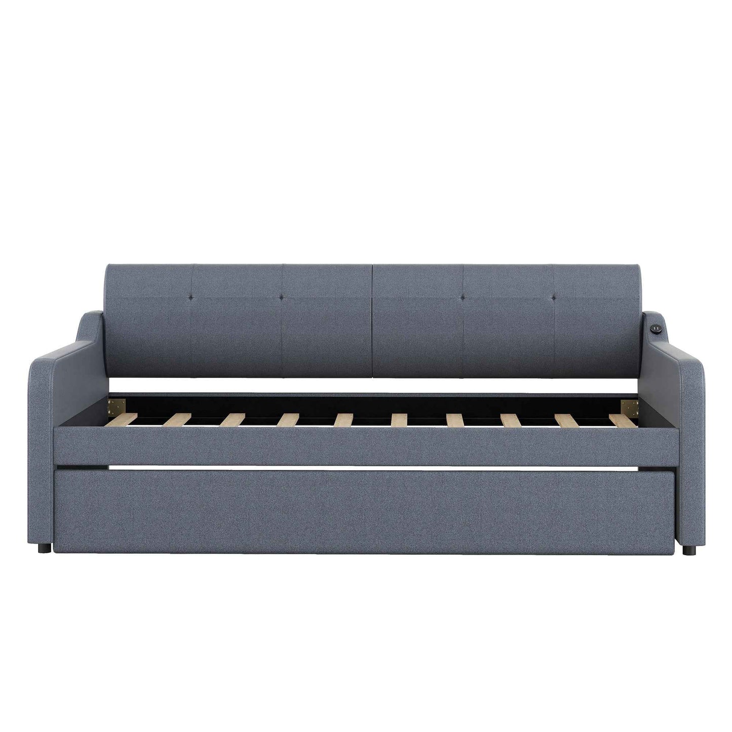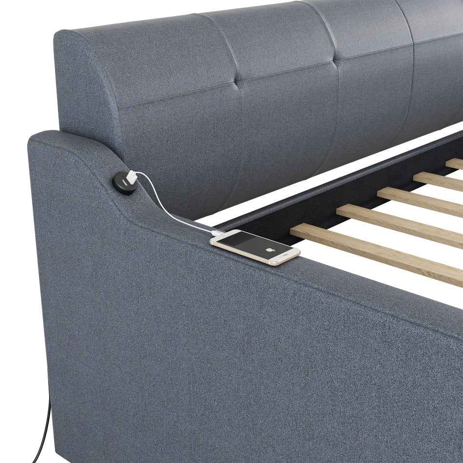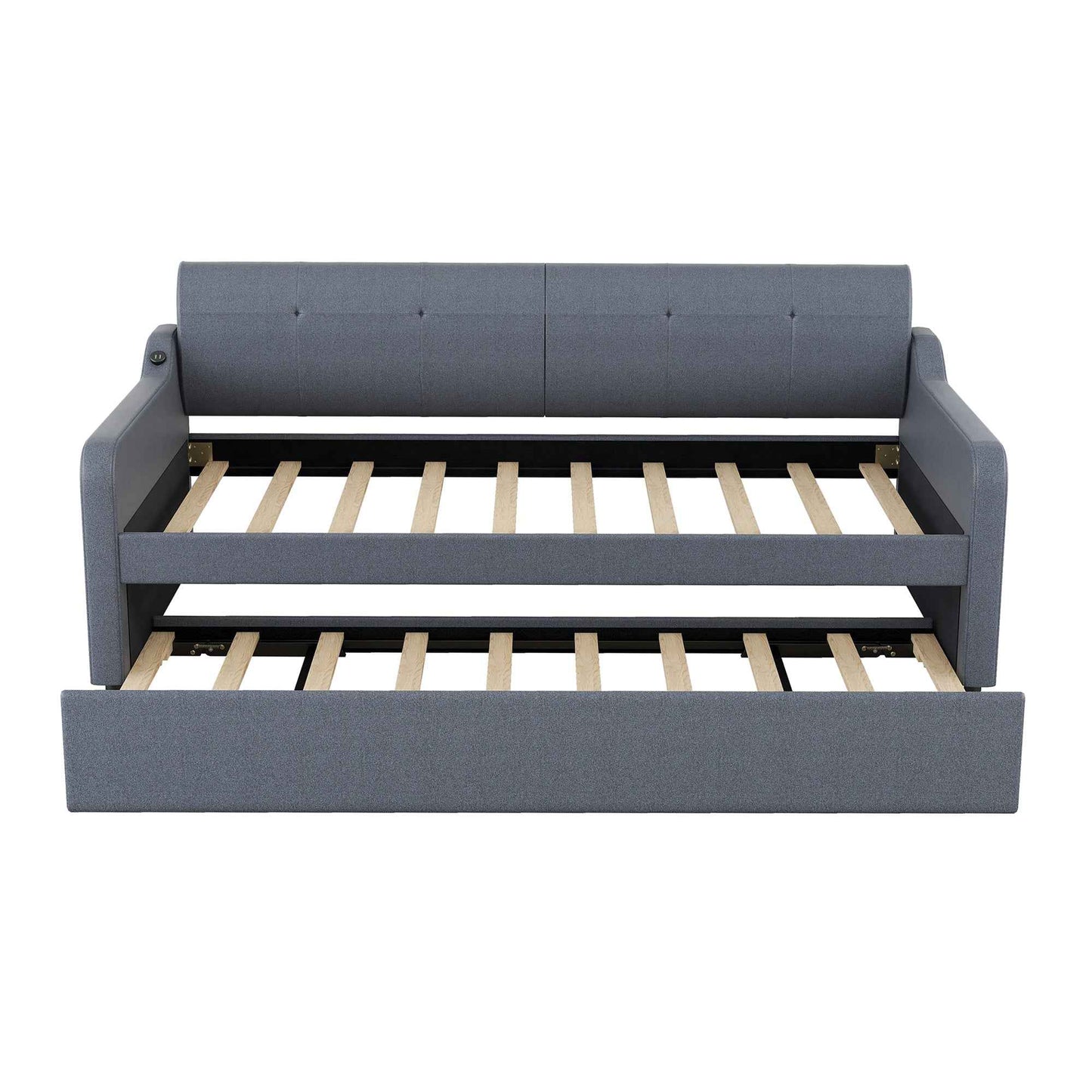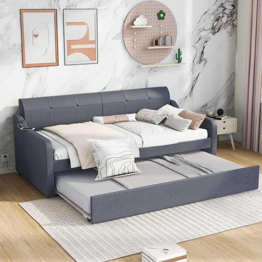 If you need extra sleeping space or your kids' love sleepovers, this daybed with a handy pull-out trundle is perfect for your home. The right armrest also has a USB charging design. When you are lying on the sofa and your phone is out of power, you can charge your phone in time.High-quality legs and a strong, durable frame ensures stability and durability for long-term use. This daybed is designed with a clean silhouette and a hue of elegance.The trundle can be laid directly on the ground, or it can be erected at the same height as the daybed.It suits all styles of home decoration and completes the look of any bedroom.