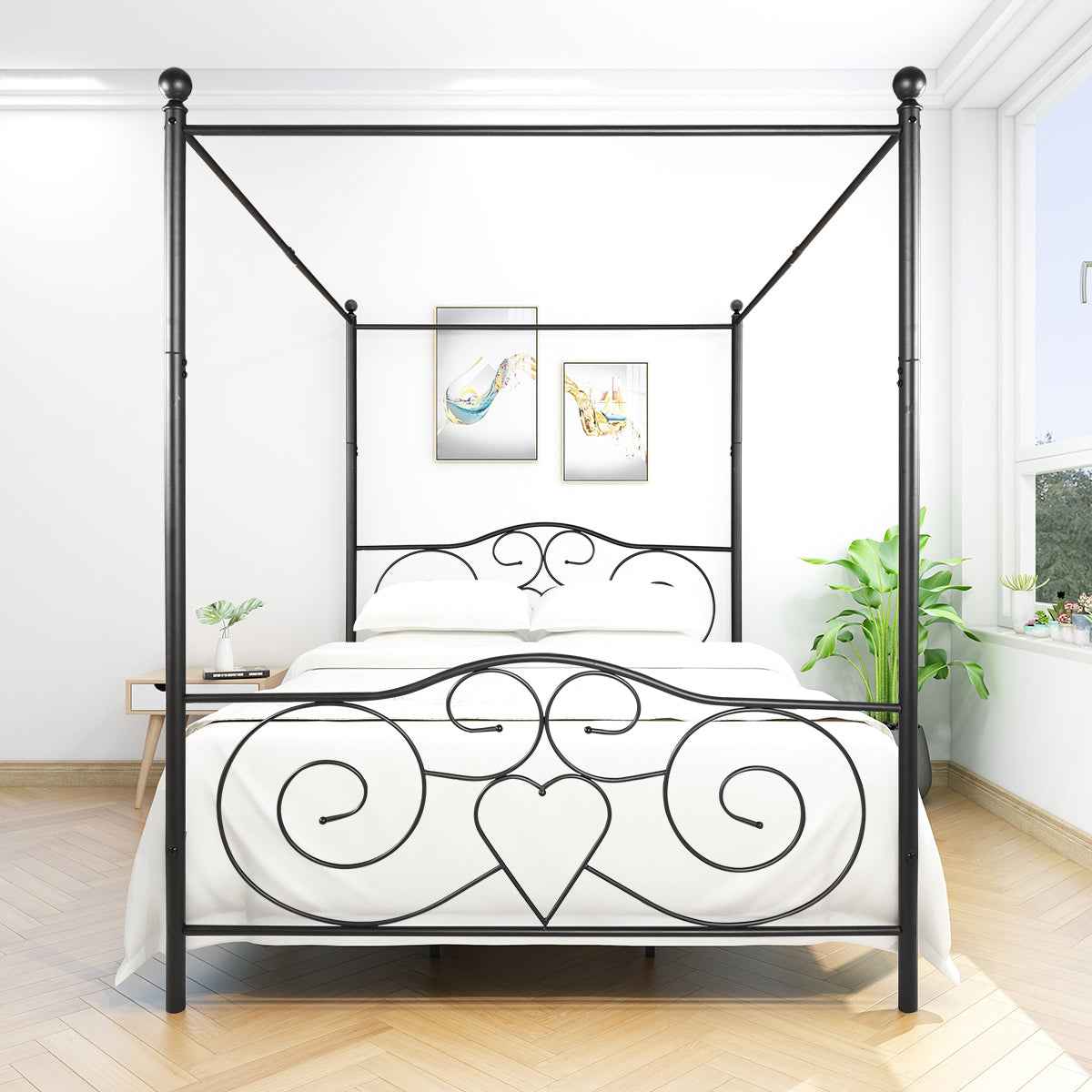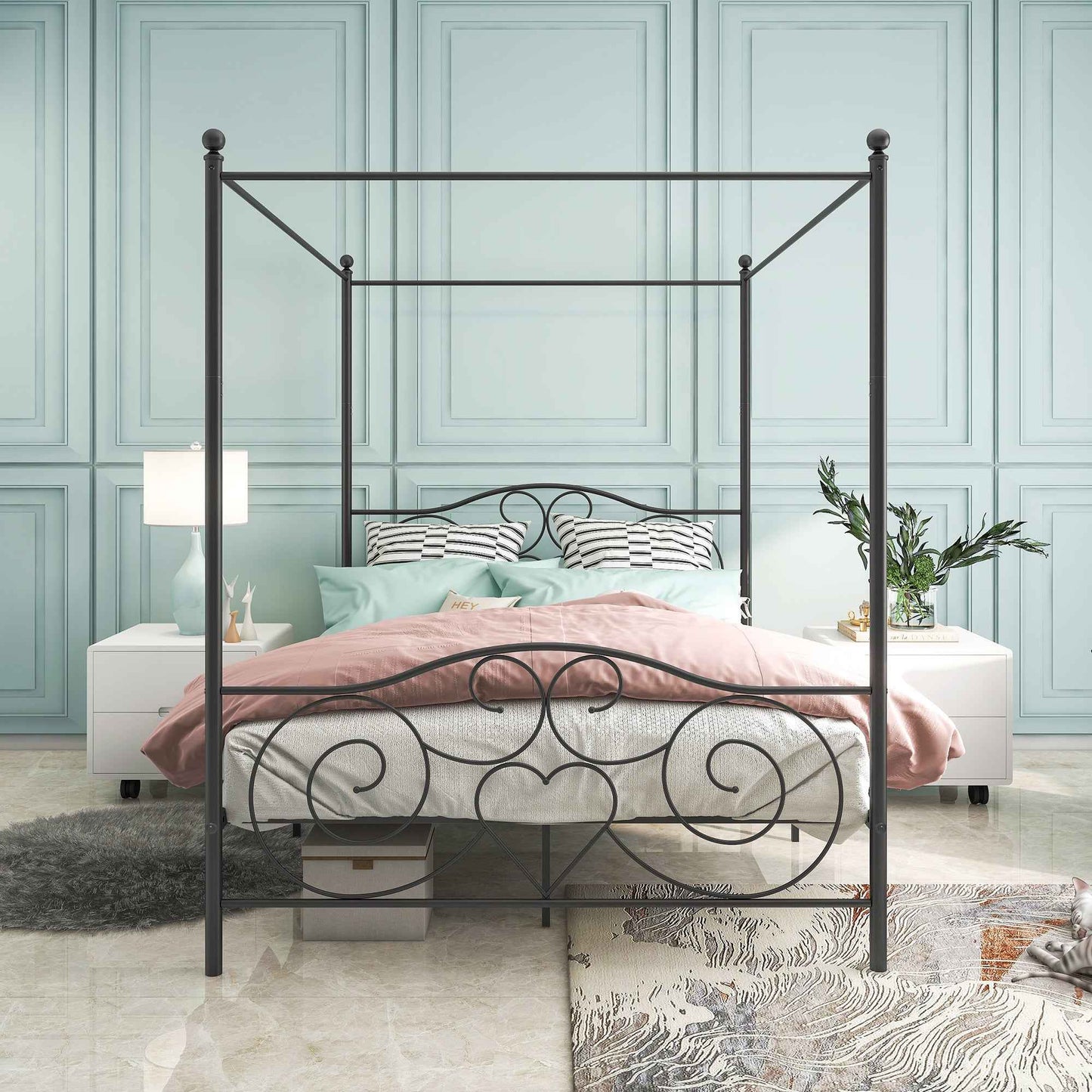 Faery Vintage Metal Queen Size Canopy Bed Frame | Black