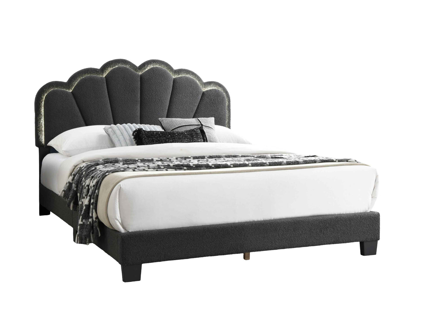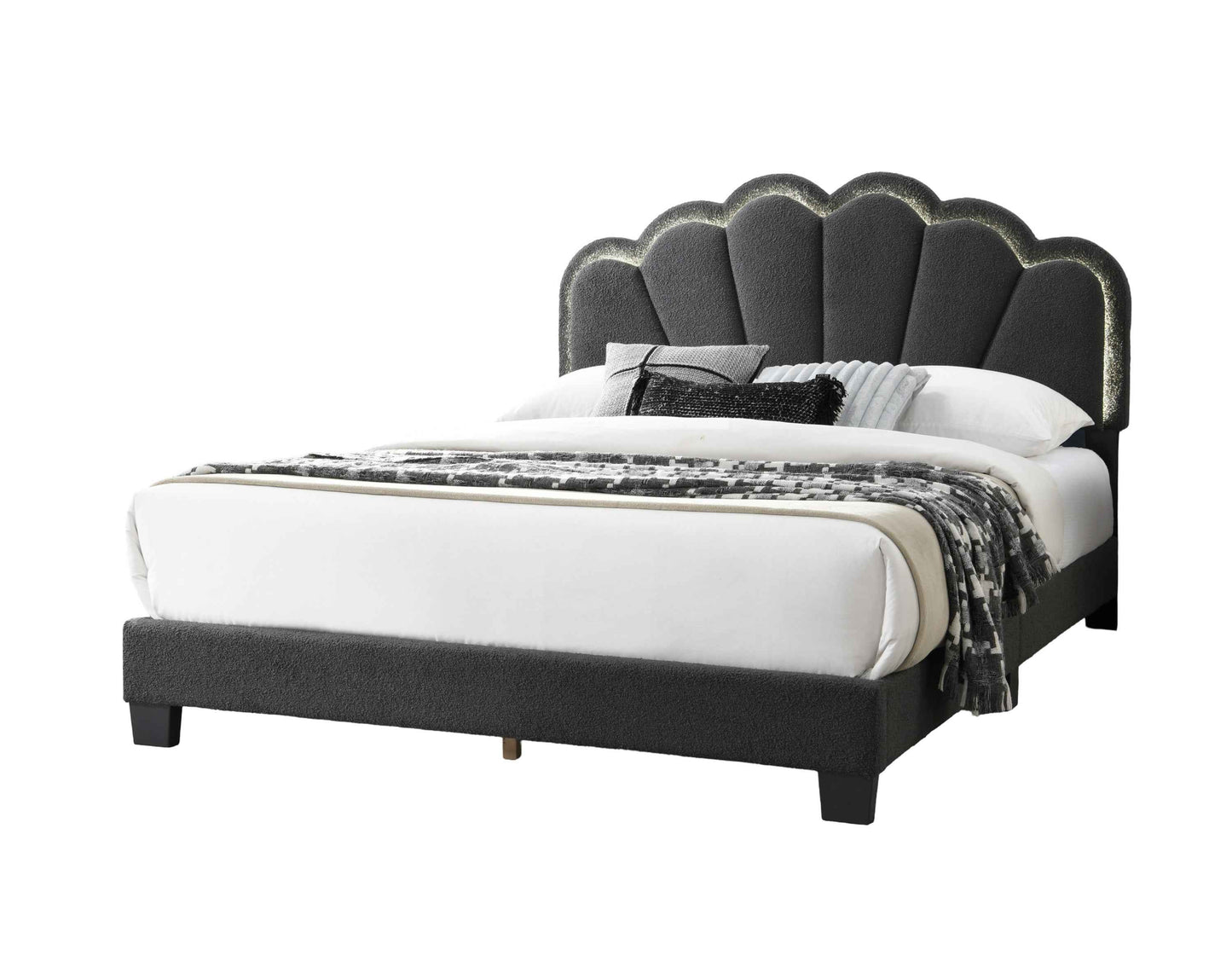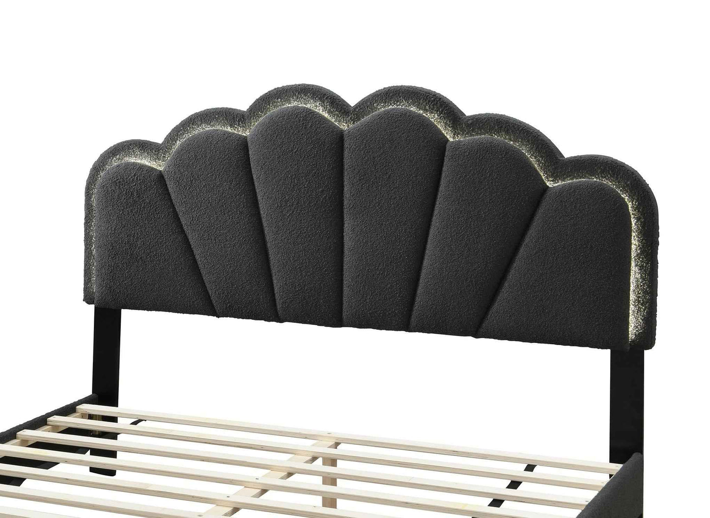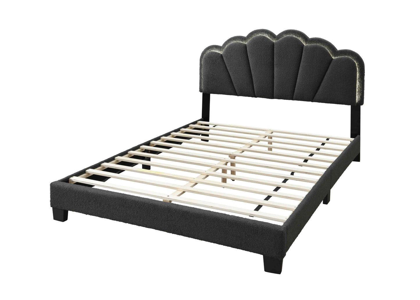 Designed for both aesthetics and functionality, this bed promises to be the centerpiece of your room, combining luxurious materials with thoughtful features. Designed without the need for a box spring, this platform bed ensures sturdy support and a sleek, low-profile look. Equipped with robust support legs, the bed guarantees stability, ensuring a good night's sleep every night. The plush headboard is adorned with a delicate floral design that adds a touch of elegance and charm. The footboard complements the headboard while maintaining a streamlined appearance. The headboard features built-in LED lights, offering subtle, ambient lighting perfect for reading or creating a cozy atmosphere. Whether you are redesigning your bedroom or looking for a statement piece to enhance your space, this Queen Wool Fabric Platform Bed is the perfect choice.