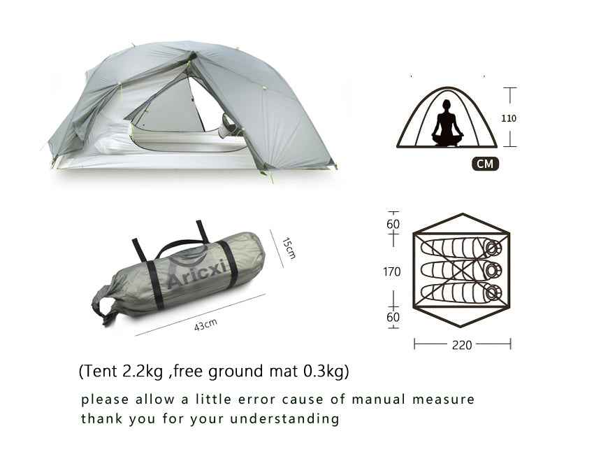 Constructed from an aluminum alloy and silicone coated nylon, this double-layer tent can comfortably accommodate two to three people and has an impressive waterproof index of 3000MM and above. A complete set featuring an internal account, external account, floor cloth, aluminum rod, binding strap, floor nail, wind rope and storage bag. This marvelous four-seasons ball tent can survive even the most intense of storms.