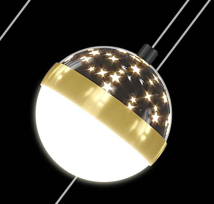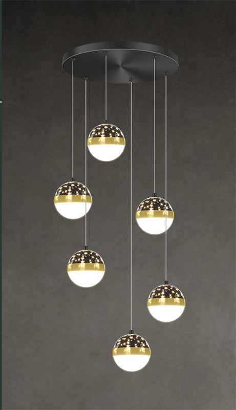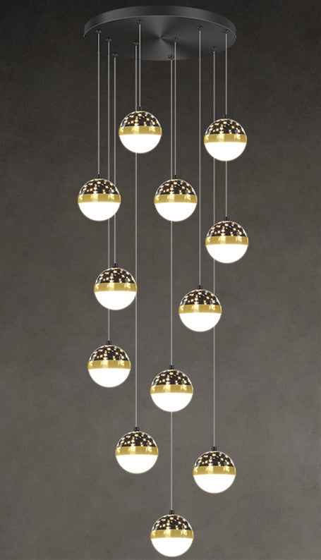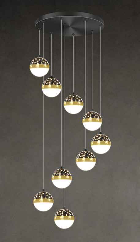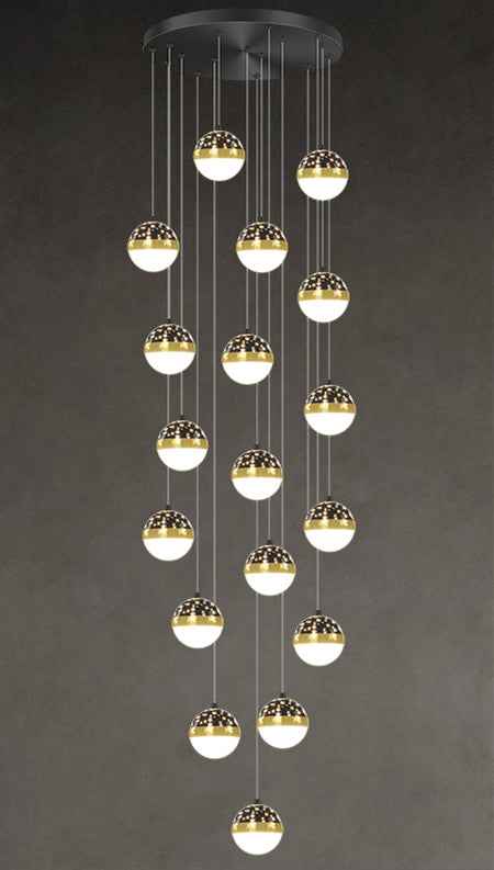 The luxury Diulio staircase chandelier features a minimalist, modern design and is equipped with a power range of 100W (included) to 300W (not included). It is crafted with a lamp body made from iron and a PMMA high transmittance lampshade. The light source, LED, has a color temperature value of 5000K and is well-suited for spaces ranging from 15 to 30 square metres, such as lofts and duplex residences. It is available in four options: black six-head tricolor dimming, black nine-head tricolor dimming, black twelve-head tricolor dimming, and black eighteen-head tricolor dimming, and has a voltage range of 111V to 240V.
