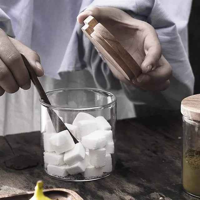 Crafted with an exquisite blend of wood and glass, this 9 x 9 x 8.2cm jar offers a spoon and a removable wooden lid, aiding in the prevention of moisture and dust. The glass jar with a spoon is ideal for storing a variety of condiments and non-mixing of seasonings. Its size makes it perfect for fitting onto most tablecloths, enhancing the decor of the home kitchen, dining environment or restaurant. Containing a capacity spacious enough for condiments, oil, vinegar, spices, seasoning, salt, peppers, small snacks and more, this seasoning jar is an indispensable companion to picnics and dining alike.