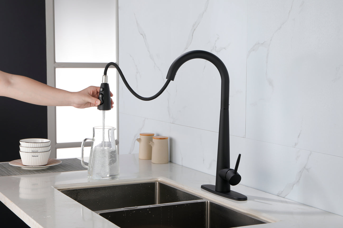 - Easy to Install---Pull down hose and water Line hose altogether preinstalled in kitchen faucet to save much time under the sink,no require plumber,finish DIY installation less than 30 minutes.