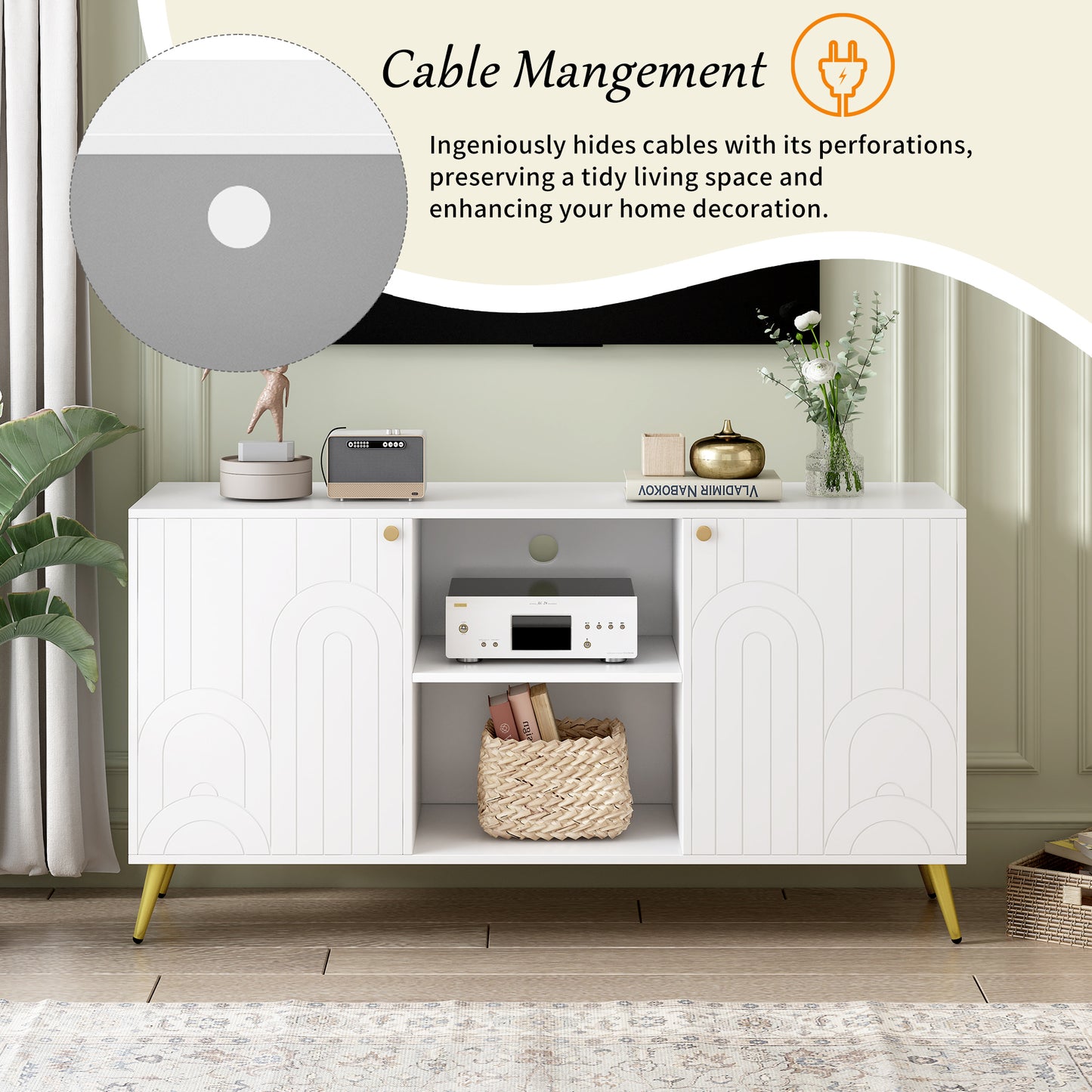 - The TV stand has a storage hole on the back panel, allowing for easy cable management and organization, keeping the area behind the cabinet neat and free from tangled wires.