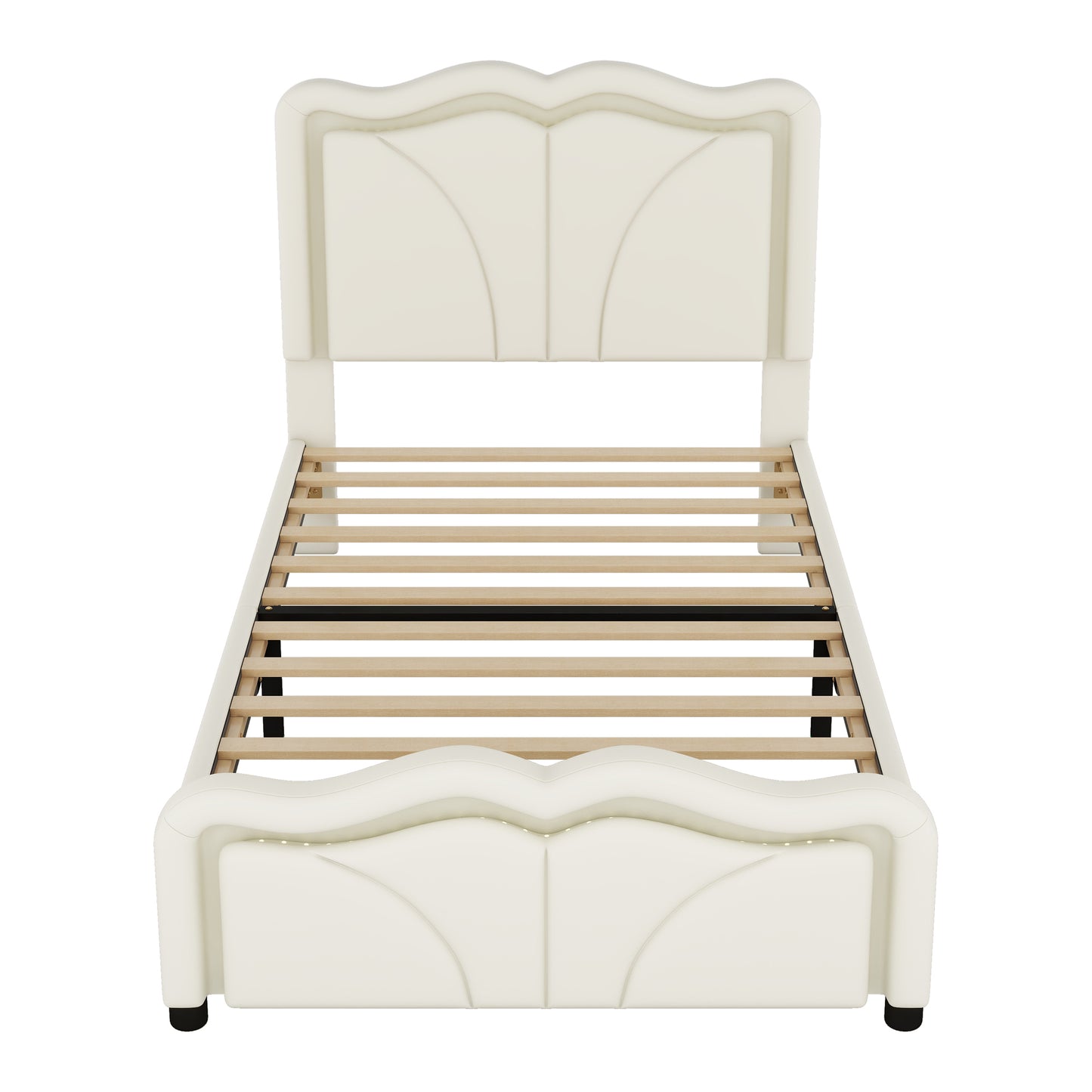 - [Fantastic Appearance] This kids bed features a fantastic design with cute curve shaped headboard, which is loved by little ones and will be an excellent addition to the their room. ] This bed is equipped with a PU padded headboard. The interior of the soft mattress headboard is filled with sponge, covered with high-quality PU leather, which is easy to clean and protects children from bumps.