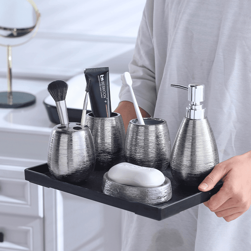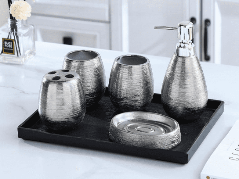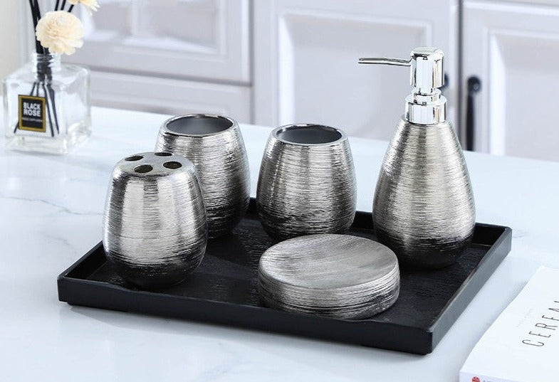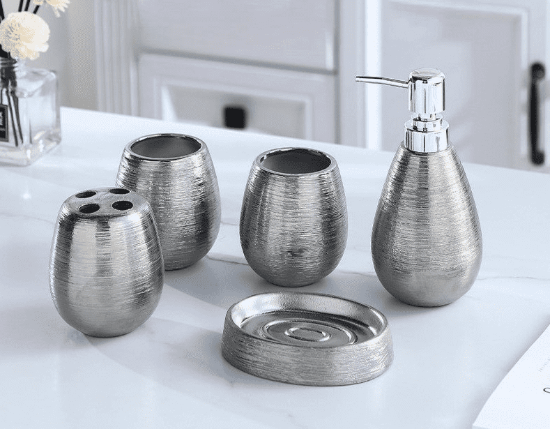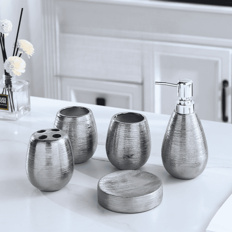 Experience everyday luxury with our vintage ceramic bathroom five-piece set. Crafted with superior quality, this sophisticated set offers a modern take on a classic design. Consisting of five beautiful pieces, each coated in a sleek silver brushed finish, this timeless set will elevate your bathroom to new heights of elegance.
